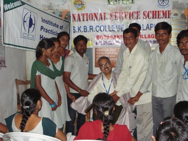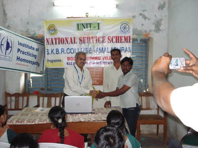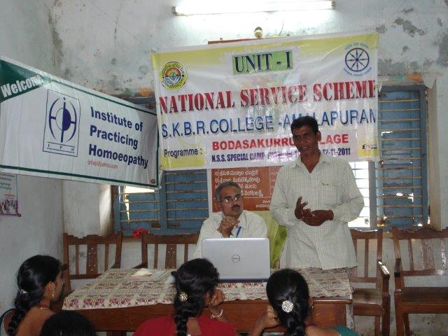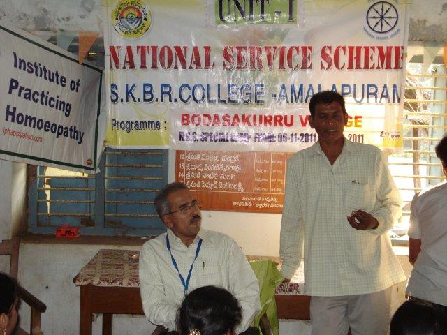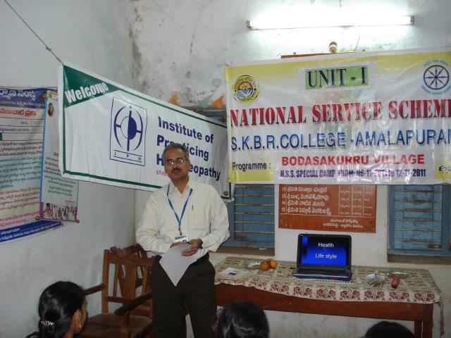 The National Service Scheme (NSS) unit of SKBR College, Amalapuram and Institute of Pacticing Homoeopathy (IPH) jointly organised an awareness programme to the volunteers and Public at Panchayat Office, Bodasakurru village of East Godavari District of Andhra Pradesh. Mr. K. V. V. SATYANARAYANA, Programme officer NSS Unit – I inaugurated the programme. Dr. B. S. MOHAN, Director, IPH, was the chief guest and speaker of the day, explained the things behind health, maintaining the health, requirement of healthy place and Life style. Along with the lifestyle he stressed the need and importance of Hereditary, Environment, Profession, Income, Family relation, Health & Family Planning, Socio economic status and activities of Local Governments in maintaining One’s Health status. He introduced Homoeopathy to the gathering with its Origin, Principles, Specialities, Advantages, importance in present day’s health care.