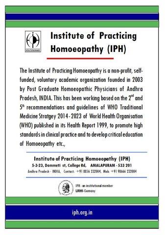 In a press release from their IPH administrative office, today, the director details about Institute of Practicing Homoeopathy (IPH) which is a non-profit, self-funded, voluntary academic organization founded in 2003 by Post Graduate Homoeopathic Physicians of Andhra Pradesh. It has been working based on the 2nd and 5th recommendations of World Health Organisation (WHO) published in its Health Report 1999 to integrate Homoeopathy in public health care. The main area of interest of IPH is Practice Management and Clinical evidence in Homoeopathy.IPH is an institutional member of LMHI- Germany.
